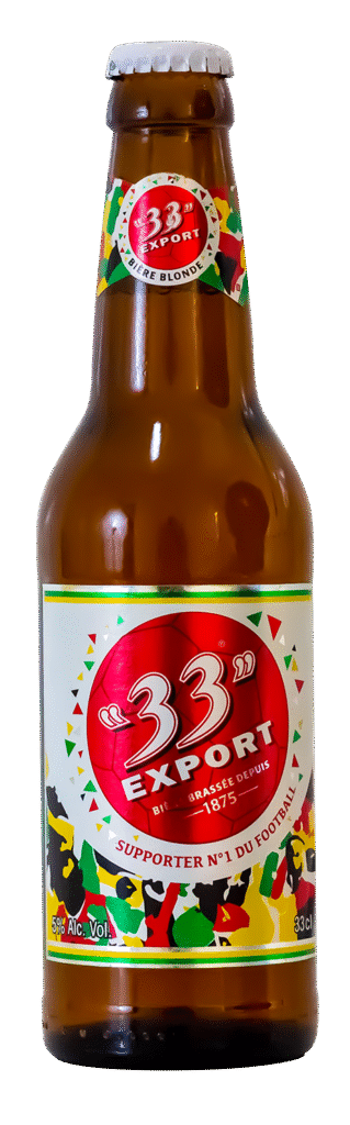 33 EXPORT est une bière blonde brassée depuis 1975 avec du malt et du houblon spécialement sélectionnés, et dont le taux d’alcool de référence est de 5%. C’est la combinaison de ces ingrédients et l’expérience de nos maîtres brasseurs qui font d’elle une bière de grande qualité, désaltérante, rafraîchissante, fine et au goût unique. C’est la bière qui rassemble et accompagne les événements footballistiques : le supporter n°1 du football !