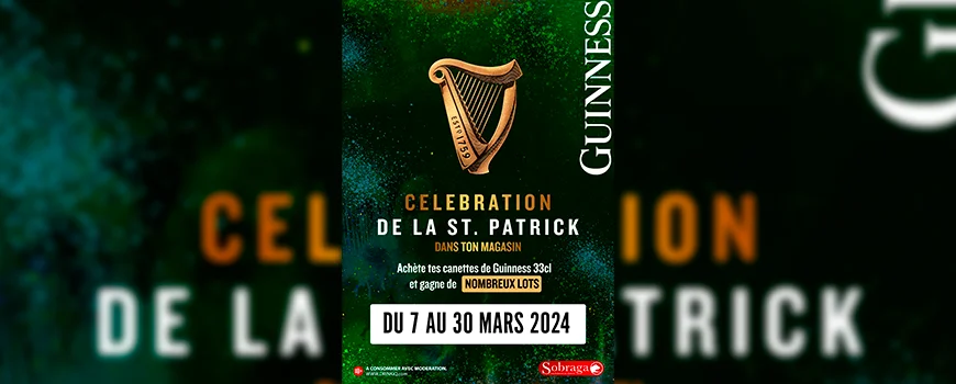 Prêts à vivre un mois de mars épique avec la plus célèbre des stouts ? Guinness célèbre la Saint Patrick, fête populaire et historique irlandaise, dans vos points de vente dédiés du jeudi 7 au samedi 30 mars. Une occasion unique pour les fans et les consommateurs de partager des moments conviviaux et festifs autour de la mythique bière brune et de gagner de nombreux lots ! Une chance également pour d’obtenir des billets d’invitation pour la grande soirée chic Guinness « Black and Green » qui aura lieu au MASAYA’S GARDEN le 23 mars prochain.